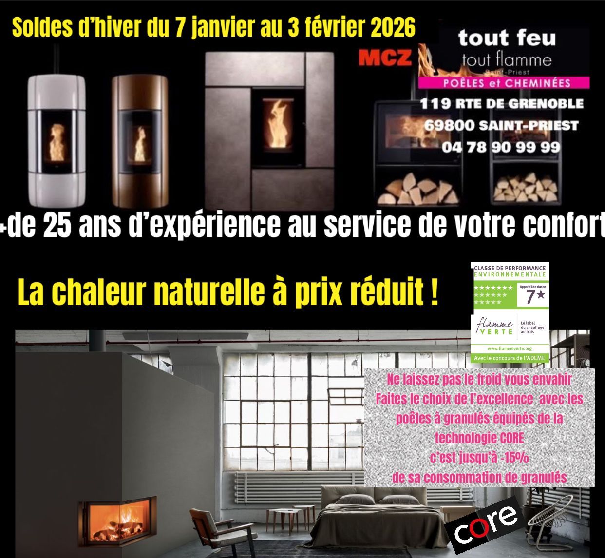 Vous voulez contrôler votre facture de chauffage, limiter la récente hausse du prix de l'électricité ? Choisir un poêle à granulés pour utiliser la technologie au service de votre porte-monnaie, mais ne savez pas lequel privilégier ni comment le choisir ? Tout feu tout flamme Saint-priest vous propose d'analyser les besoins de votre habitation pour cibler les pathologies de votre maison et un large choix de poêles à granulés,d' inserts à granulés, de chaudières à granulés, et aussi des poêles à bois, des cheminées, parmi les plus grandes marques du marché, qui sauront répondre aux besoins particuliers de votre foyer, les marques de renom MCZ, Cera Design, Palazzetti... et les aides gouvernementales soutiennent les projets les plus ambitieux pour un chauffage 100% silence, flamme verte, tout en conservant le charme de la flamme. Découvrez chez tout feu tout flamme Saint-Priest la nouvelle technologie "CORE" de MCZ pour une flamme écologique, économique et naturellement maîtrisée.